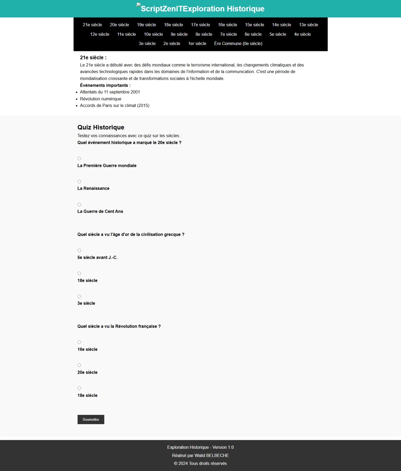 Des questionnaires interactifs permettant aux utilisateurs de tester leurs connaissances sur différents siècles et événements.