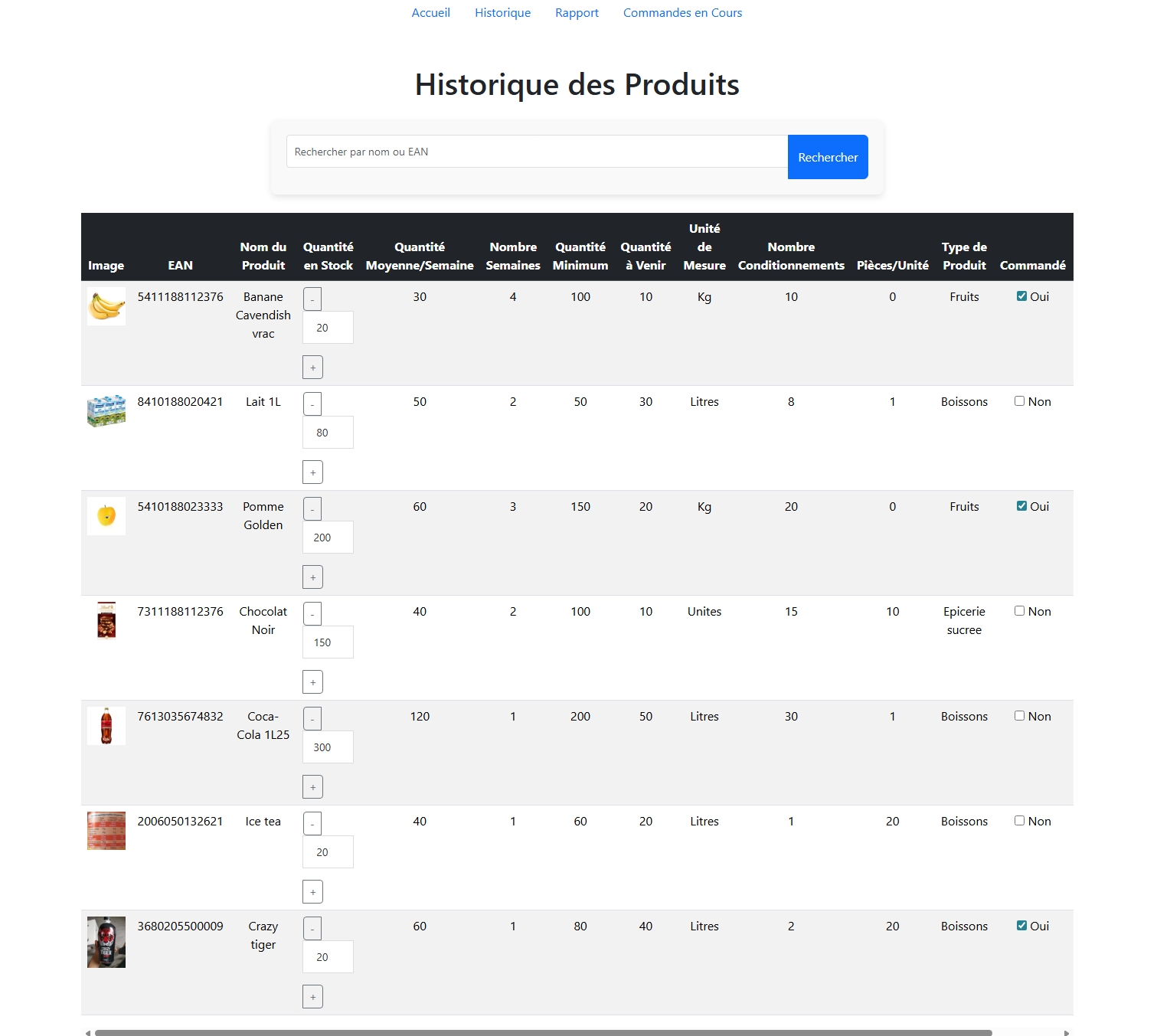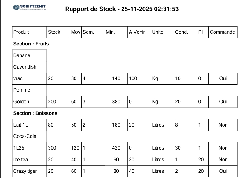 Rapports détaillés incluant les informations sur les produits, les quantités à commander, et les périodes de prévision.